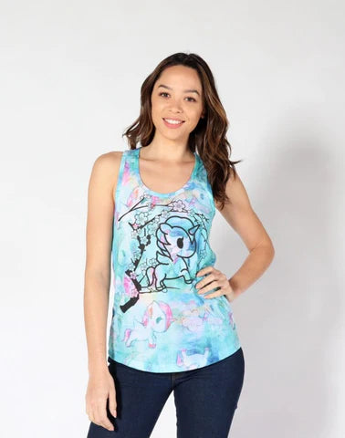 Features a unicorno among the cherry blossoms on a dreamy sublimated unicorno racerback tank top.