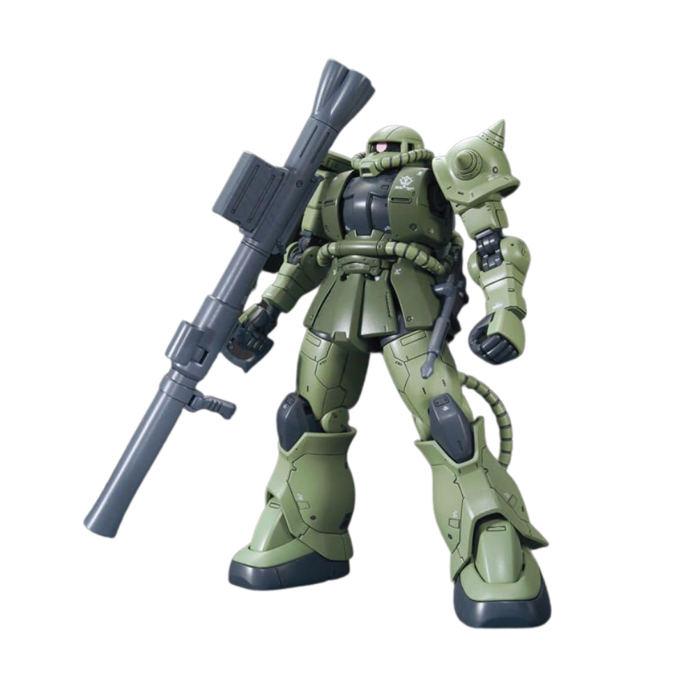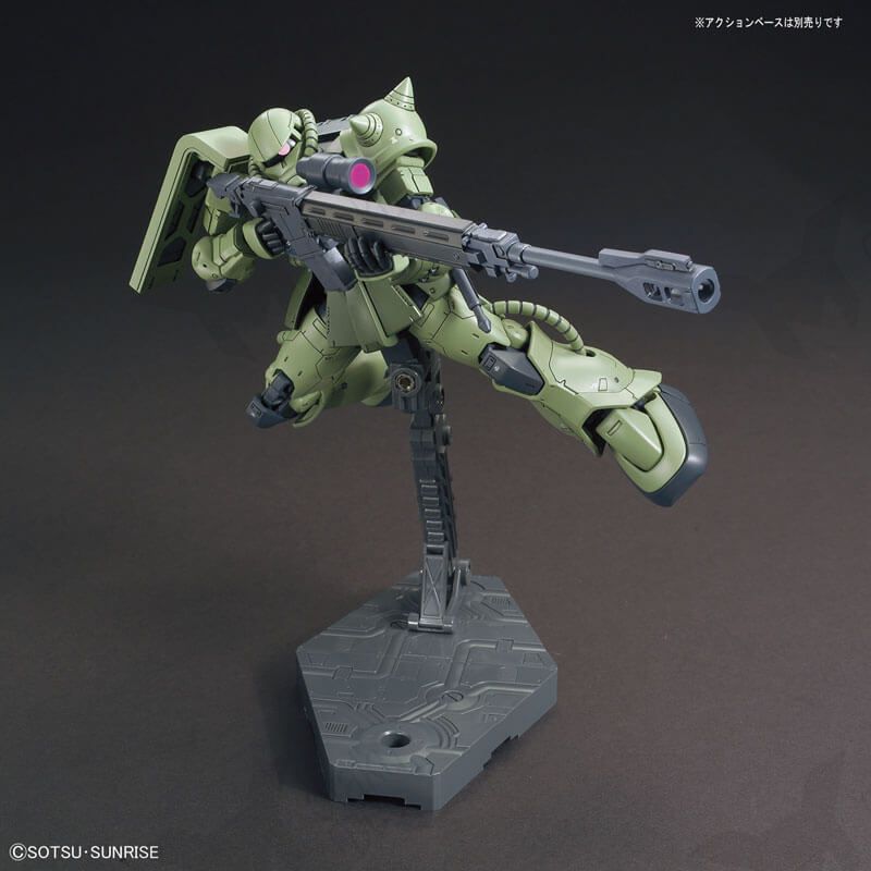 Finally the so awaited Gundam The Origin's version of the green mass produced Zaku II, as excellent as every Origin's Zaku model kit, and full in accessories, such as the characteristic from this series' sniper rifle, two heat-hawks, a Zaku Machinegun with an ammo belt, a bazooka, an aditional exclusive armor plate for an arm, and two spare ammunition cartridges for the bazooka!
