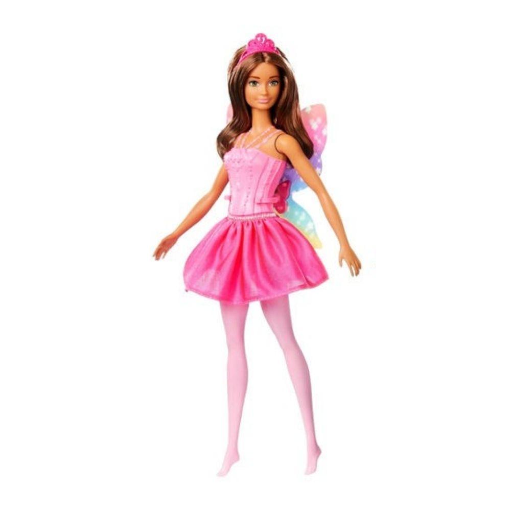 The Barbie fairy dolls help imaginations take flight with princess fairy looks and a pair of wings — brightly colored rainbow wings have a starry pattern to spark stories and creative expression. A pink tiara adds a royal touch for princess role-play. And a removable sheer pink fairy skirt adds fashion and styling fun. Young imaginations can tell all kinds of fairytales with these fairy dolls because you can be anything with Barbie! Collect all the Barbie fairytale dolls and accessories and let your dreams soar. Includes Barbie winged fairy doll wearing fashion and accessories.
