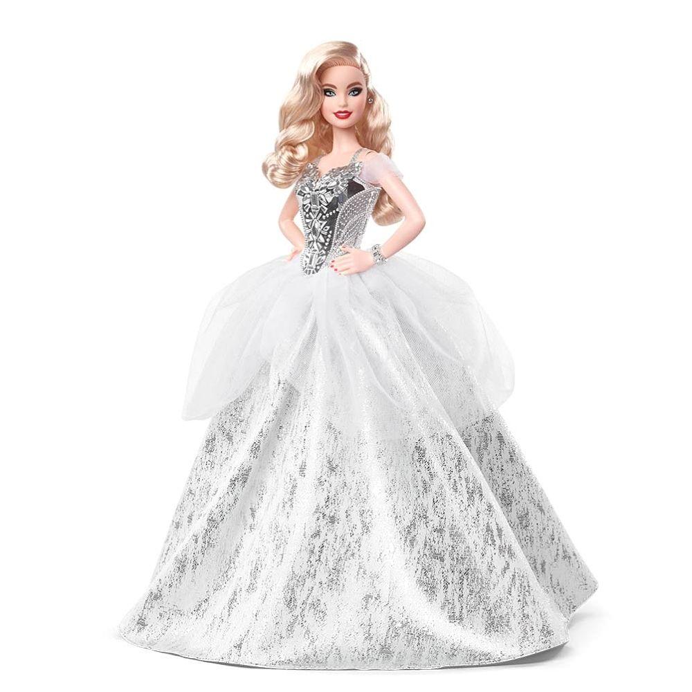 The 2021 Merry Christmas Barbie doll reflects the magic of the season wearing a gorgeous dress, sparkling with sophisticated glamor.