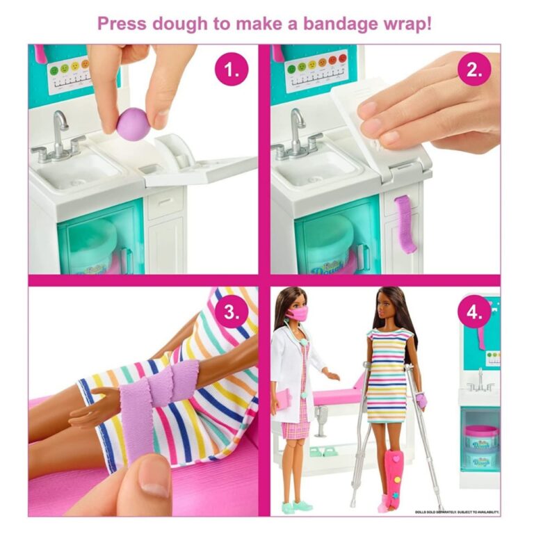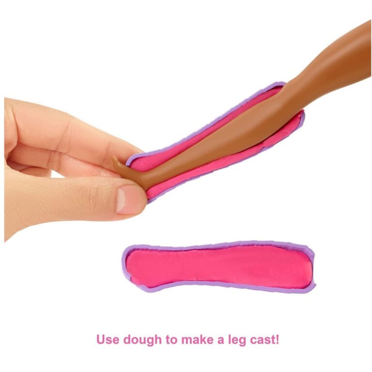 ​Barbie doctor doll can also use dough in the bandage-making station to create a wrap for her patient injuries as well!