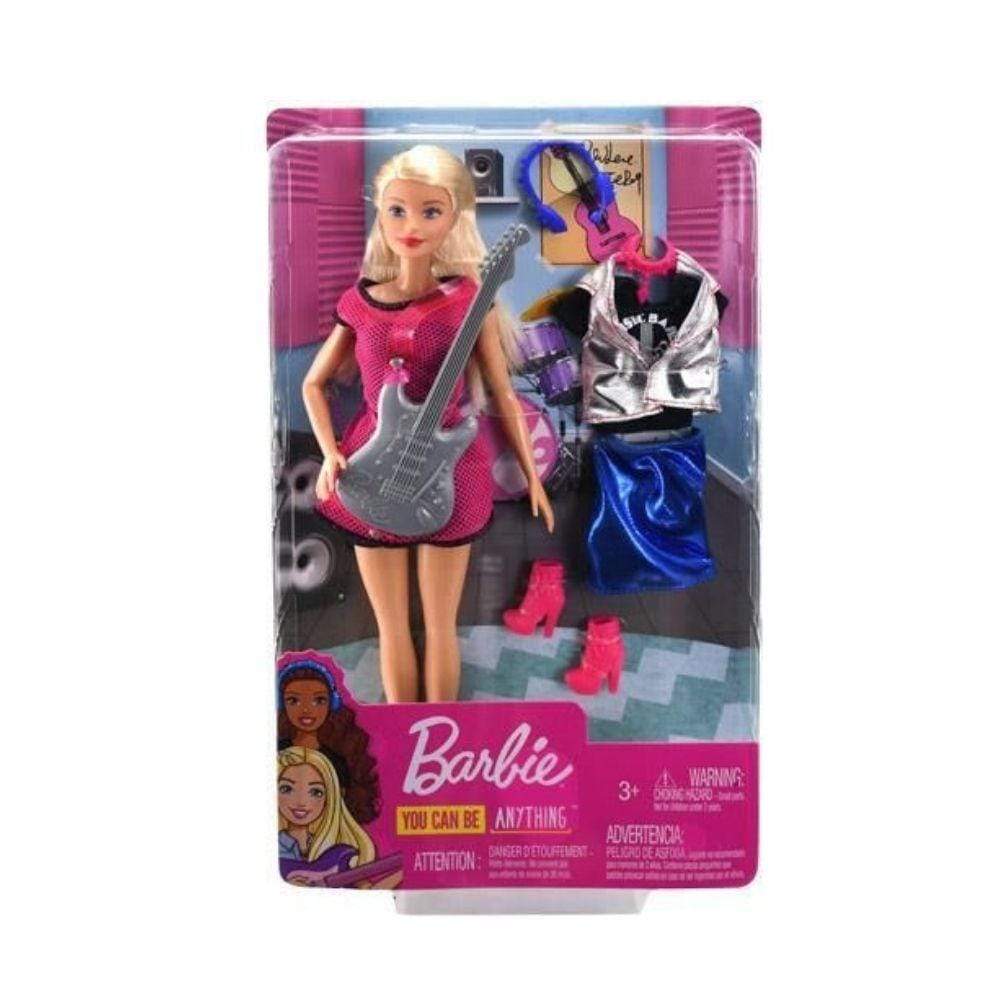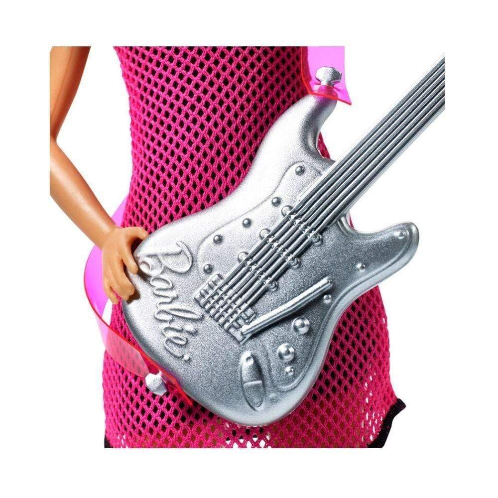 Barbie musician doll is reaching for the top of the charts -- this music career-themed set helps young music lovers play out their top hits, too! Barbie doll is ready to hit the right notes with a silvery guitar and pink strap. She can take center stage in her pink and black mesh dress and has a second outfit, a second pair of shoes and a necklace for a quick costume change. Recording headphones fall in perfect harmony with this rockin' Barbie doll and career fashion pack. Explore all the Barbie career dolls and toys to open the door to endless possibilities because when a girl plays with Barbie, she imagines everything she can become (each sold separately, subject to availability). Includes Barbie doll wearing fashion and shoes; a second outfit with graphic tee, silvery vest and blue skirt; a second pair of shoes; a necklace; a microphone headset; and a guitar with strap. Doll cannot stand alone. Colors and decorations may vary.