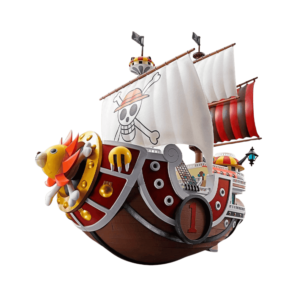 The Straw Hat Pirates' ship, Thousand Sunny, joins the Chogokin series in a super-satisfying large scale,14.96 inches long and 9.06 inches tall! This definitive collectible of the famed carrack ship incorporates a rotating Soldier Dock System and Gaon Cannon features five mini-machines and removable sidewalls to reveal the interior spaces within! It's a one of a kind portrayal fans won't want to miss. The crossbone parts act as a switch to open the Gaon cannon and the Chicken Voyage rotates!