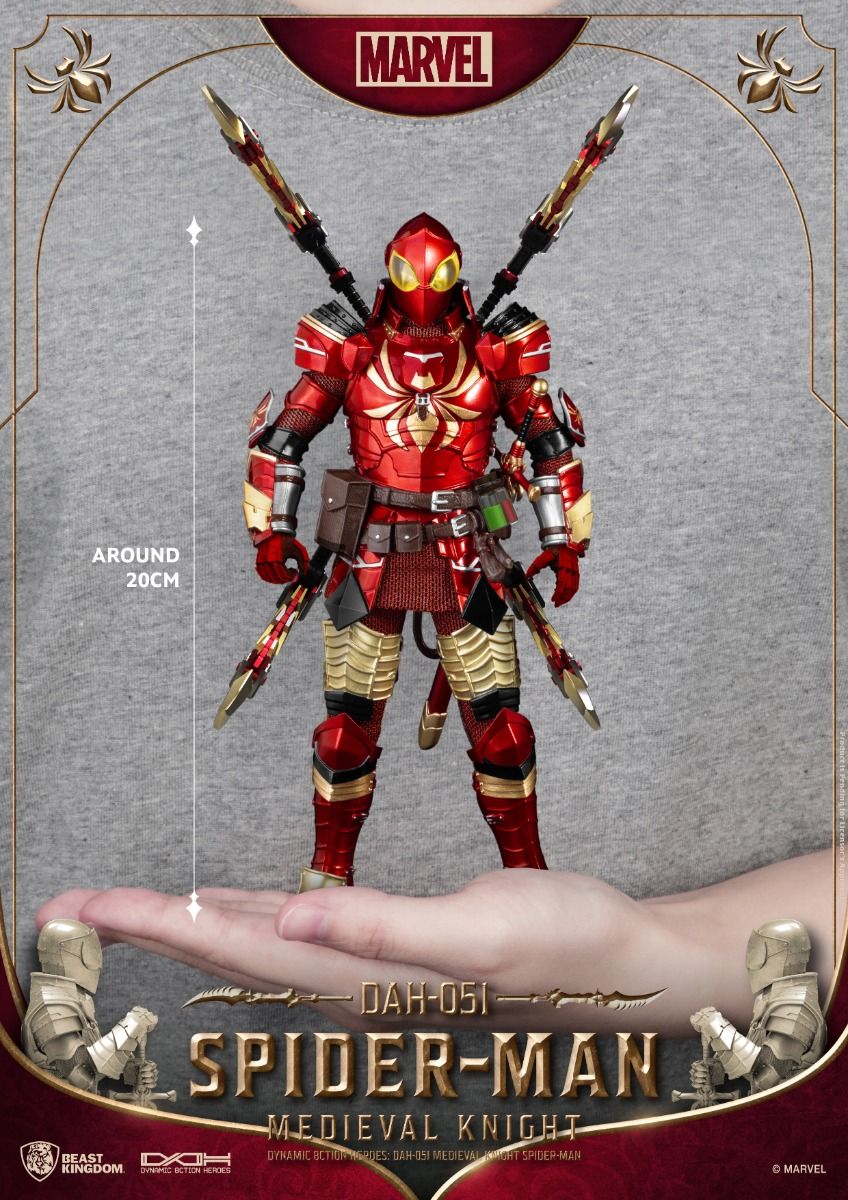 The DAH (Dynamic 8action Heroes) series under Beast Kingdom’s Entertainment Experience Brand is back with the launch of an exciting cross-over from the pantheons of ancient times. Featuring a 1:9 scale DAH body, our classic SpiderMan is now fused with the body of a noble Medieval Knight, symbolizing bravery and nobility. The unique and one-of-a-kind design incorporates multi-layered armor to showcase the intensity of the Knight. The metallic red is embellished with dazzling, royal-like golden elements, with the armor itself carefully designed to represent the fierce battle-ready character. With the Knight ready for action, the Spiderman elements are also in full force, making use of the overlapping features. Spiderman’s classic red is combined with the infamous logo printed in noble gold on the chest. Included are accessories such as detachable steel-like spider claws, which can be assembled into a double, or single-edged sword.