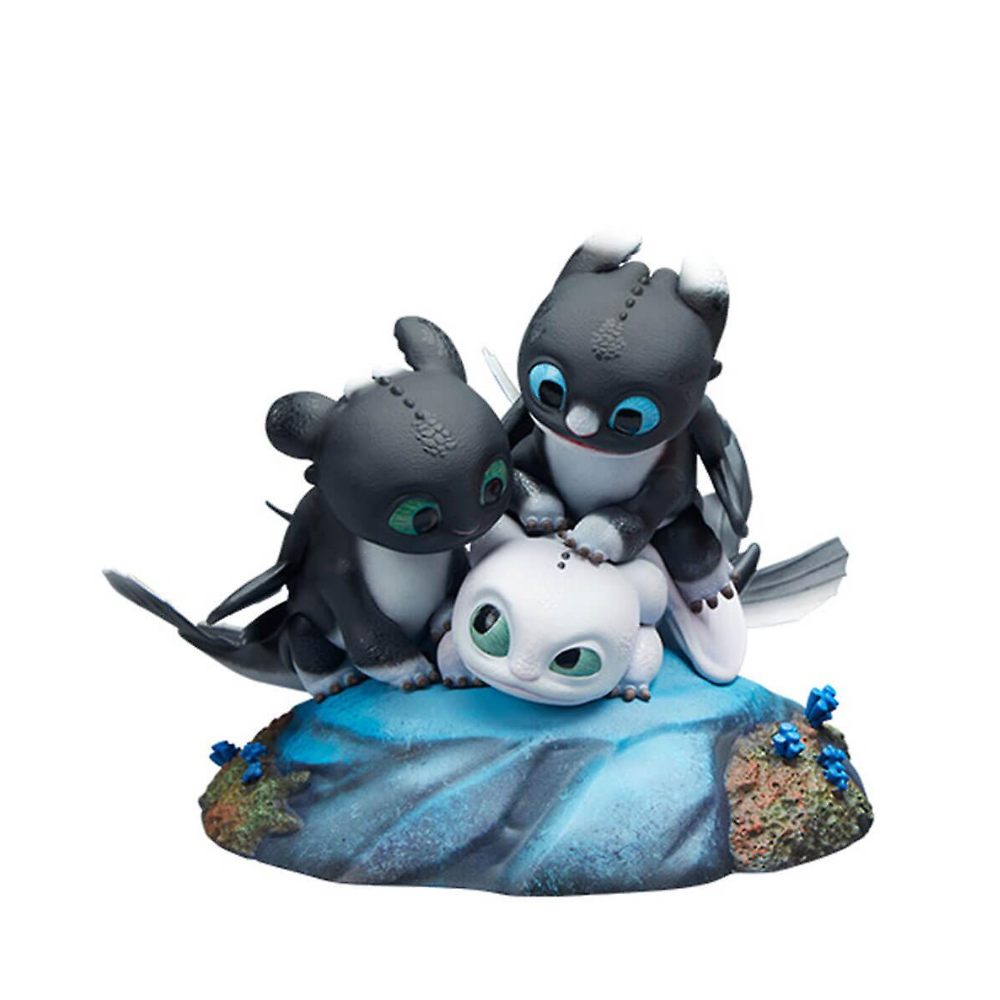 The polystone Dart, Pouncer, and Ruffrunner Statue is fully sculpted to capture the playful attitude of the three baby dragons. Dart is the girl of the group, with black and white markings and wide blue eyes. She playfully stands on her brother Pouncer’s head, who takes after the Light Fury with his predominantly white scales. Ruffrunner, the other black and white dragon in the trio, watches his siblings closely as they frolic through the Hidden World. Each dragon is sculpted with textured scales and other darling details that bring their animated appearances to life in a collectible format.