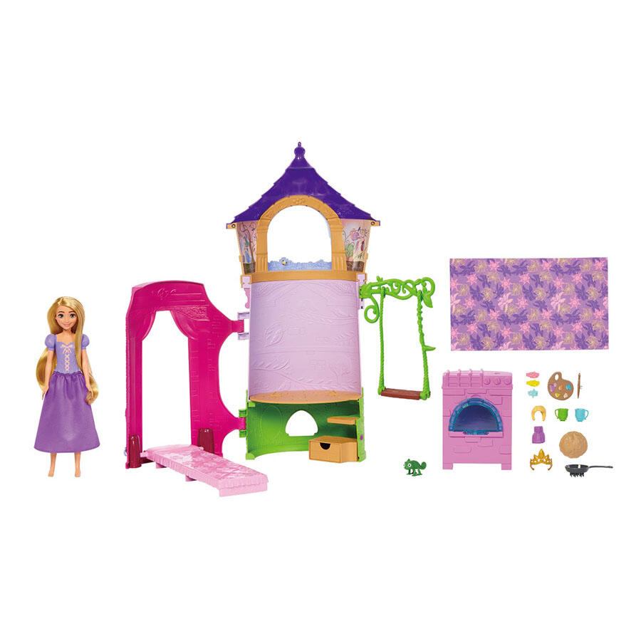 Bring to life the magical world of Rapunzel with this iconic tower playset and fashion doll from the movie.Rapunzel wears her iconic soft-goods skirt and has long rooted hair.