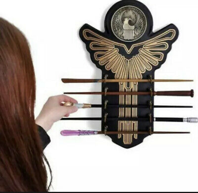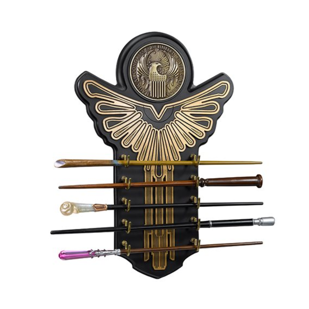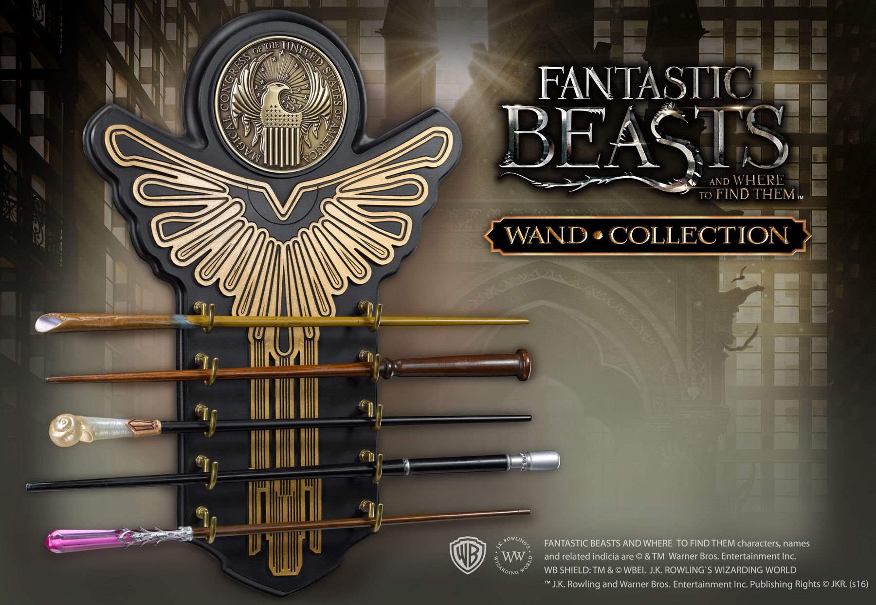 The five Fantastic Beasts wands (Newt, Porpentina, Queenie, Seraphina and Graves) presented on a hand painted wall display, measuring 16.5″ and faced with a die cast MACUSA emblem.