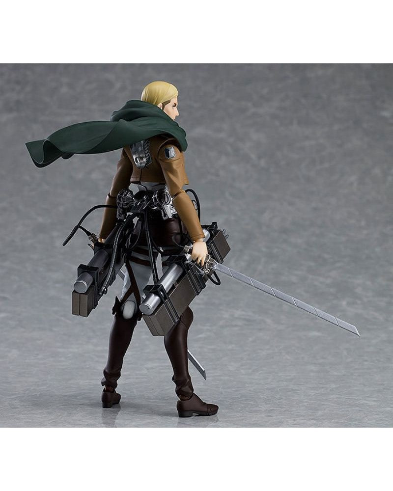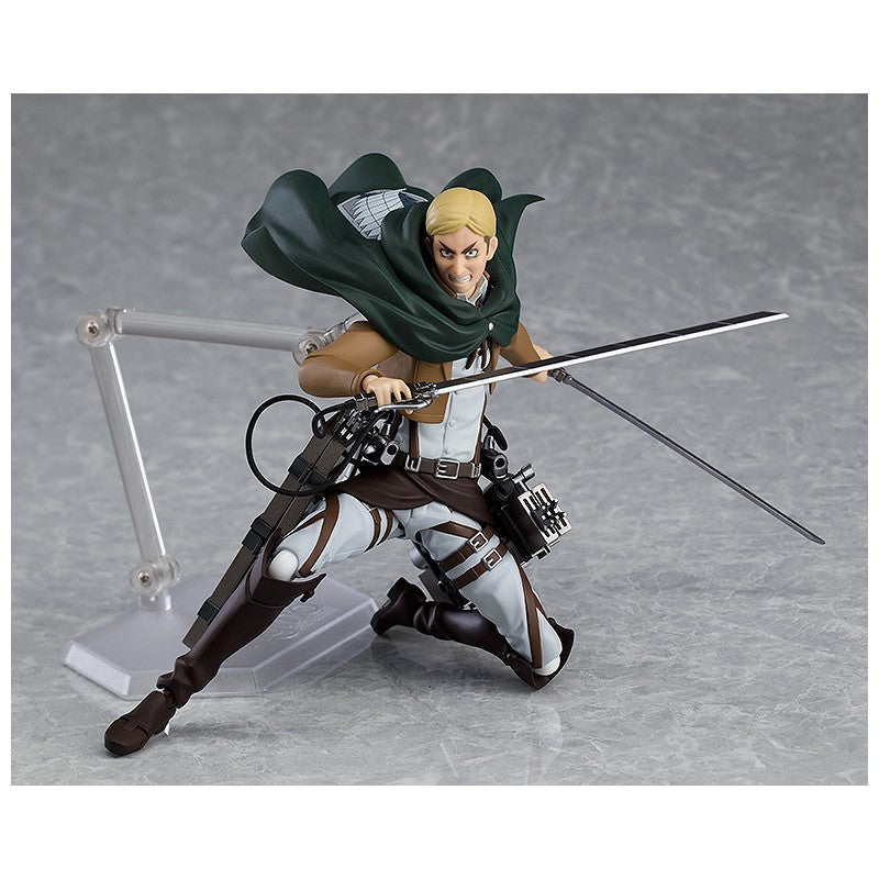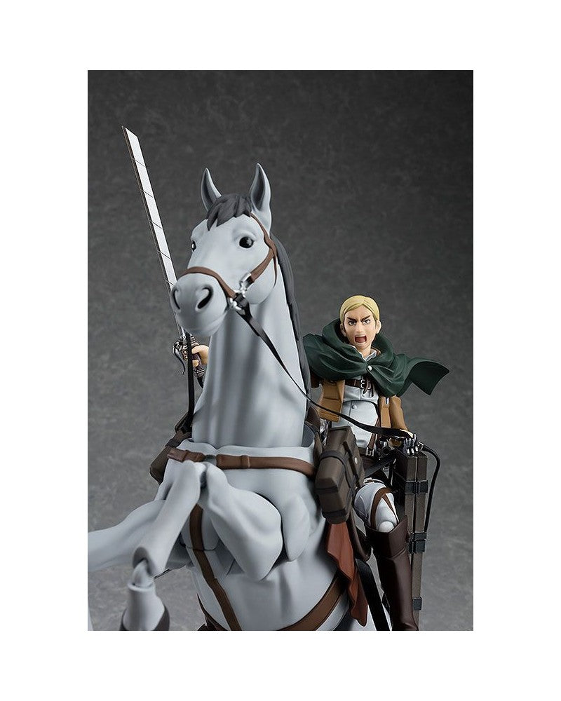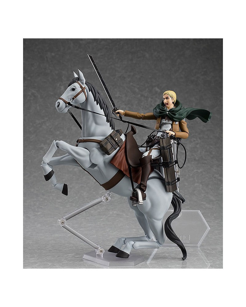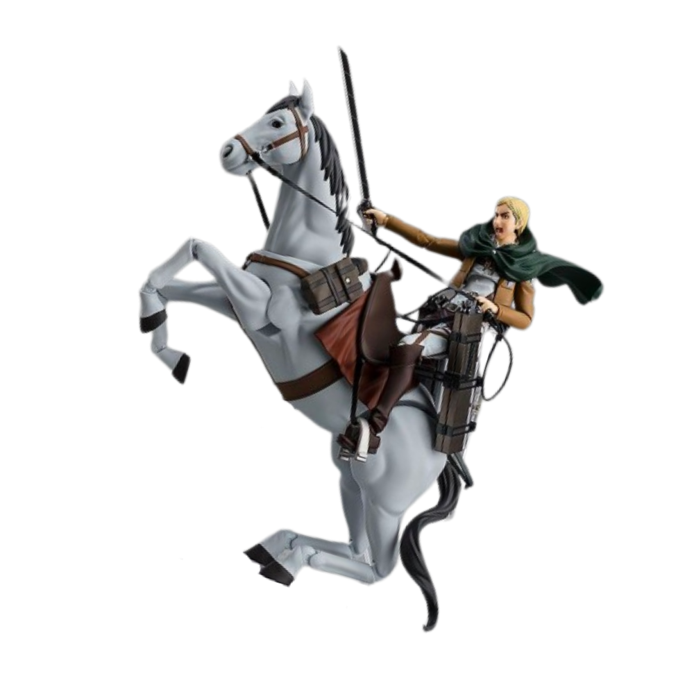 Comes with Figma Stand, 3 interchangeable face plates, 2 steel blades, Survey Corps mantle, Vertical Maneuvering Equipment, effect parts and his horse that will allow you to display in the epic poses seen in the animation!