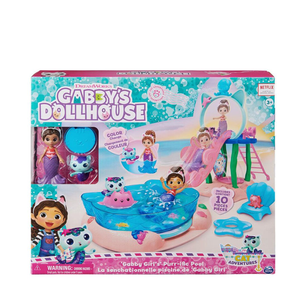 INCLUDES: 1 Playset, 1 Gabby Figure, 1 MerCat Figure, 1 Mermaid Tail, 3 Pool Accessories, 1 Opening Clam, 1 Dollhouse Delivery, 1 Octopus-Cat, 1 Chip-art Disk
