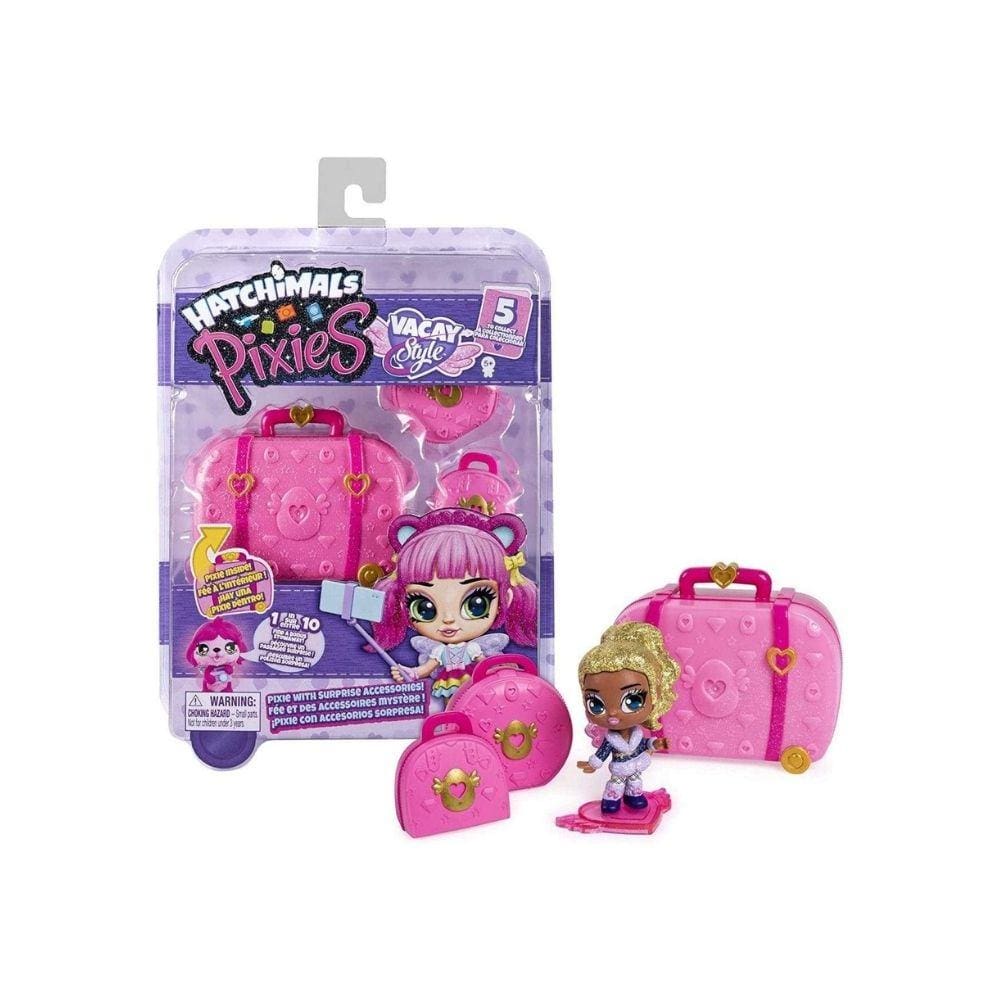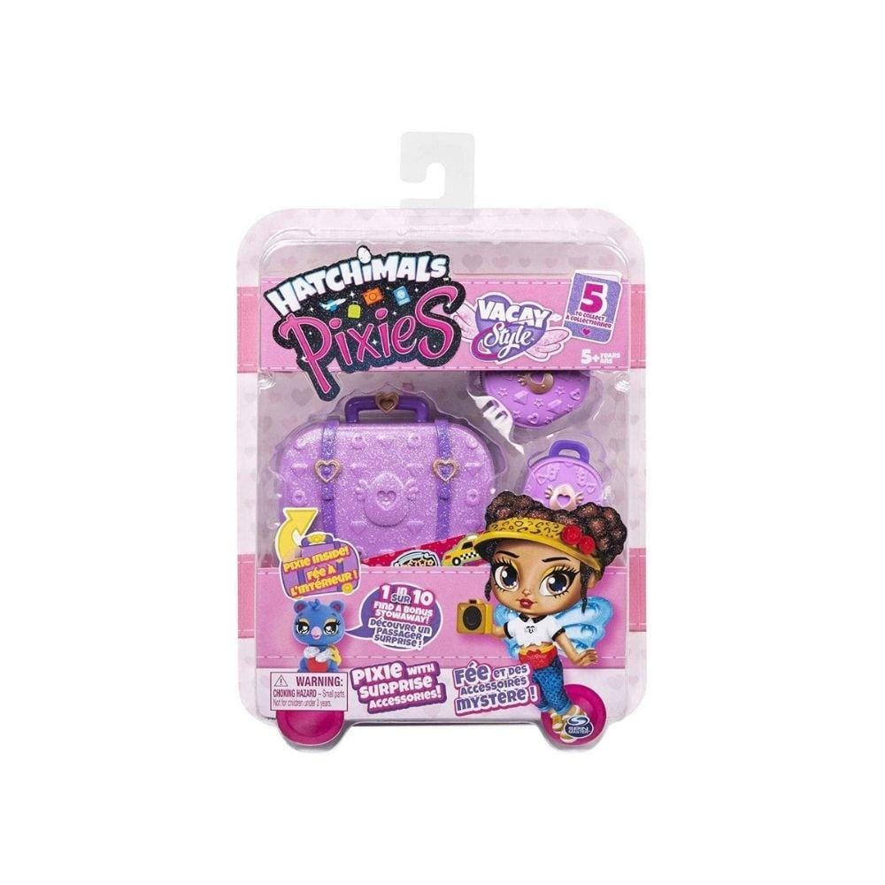 Hatchimals Pixies are leaving Hatchtopia to explore our world! These ultra-fashionable Vacay Style collectible dolls are hitting the most popular spots around the globe. The Vacay Style Pixies are dressed in the most fabulous outfits, inspired by their stylish locations! First, the Pixies are visiting five international cities like Tokyo or Paris in the Pink Passport Series. Next, theyre off to five U.S. locations like New York City or Miami in the Purple Passport Series! Open the glittery suitcase to discover your perfect Pixie, one surprise accessory, a display stand and themed stickers to decorate the suitcase. Next, crack open both of your Pixies carry-ons to find two more mystery accessories, like sunscreen, a beret, selfie stick, floral headband and more. Plus, theres a 1 in 10 chance you may even find an exclusive sweet stowaway Hatchimal inside so cute! Like all Hatchimals Pixies, the Vacay Style Pixies have magical glittery wings that really flutter, poseable heads and colourful hair. When your Pixie isnt sightseeing, display her on her stand, store her accessories in the suitcase, or use the carry-ons to play with your Pixie. With a total of 10 Pixies Vacay Style dolls to collect, where will you travel Join the glittery globetrotters, Hatchimals Pixies Vacay Style, decorate the suitcase with stickers and travel the world in style!