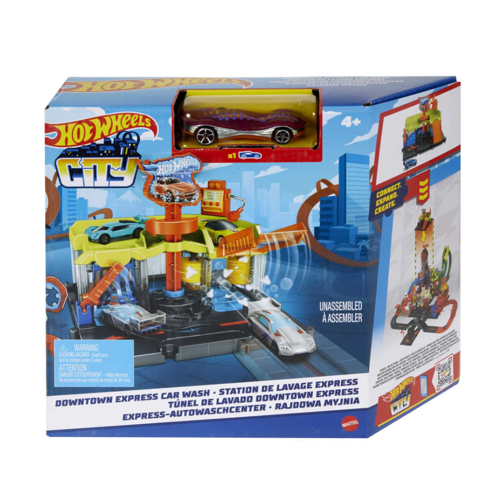 Connect the Hot Wheels™ City Downtown Express Car Wash Playset to other sets to build a unique world of fun and adventure, with cool features that increase the fun! Each set sold separately.