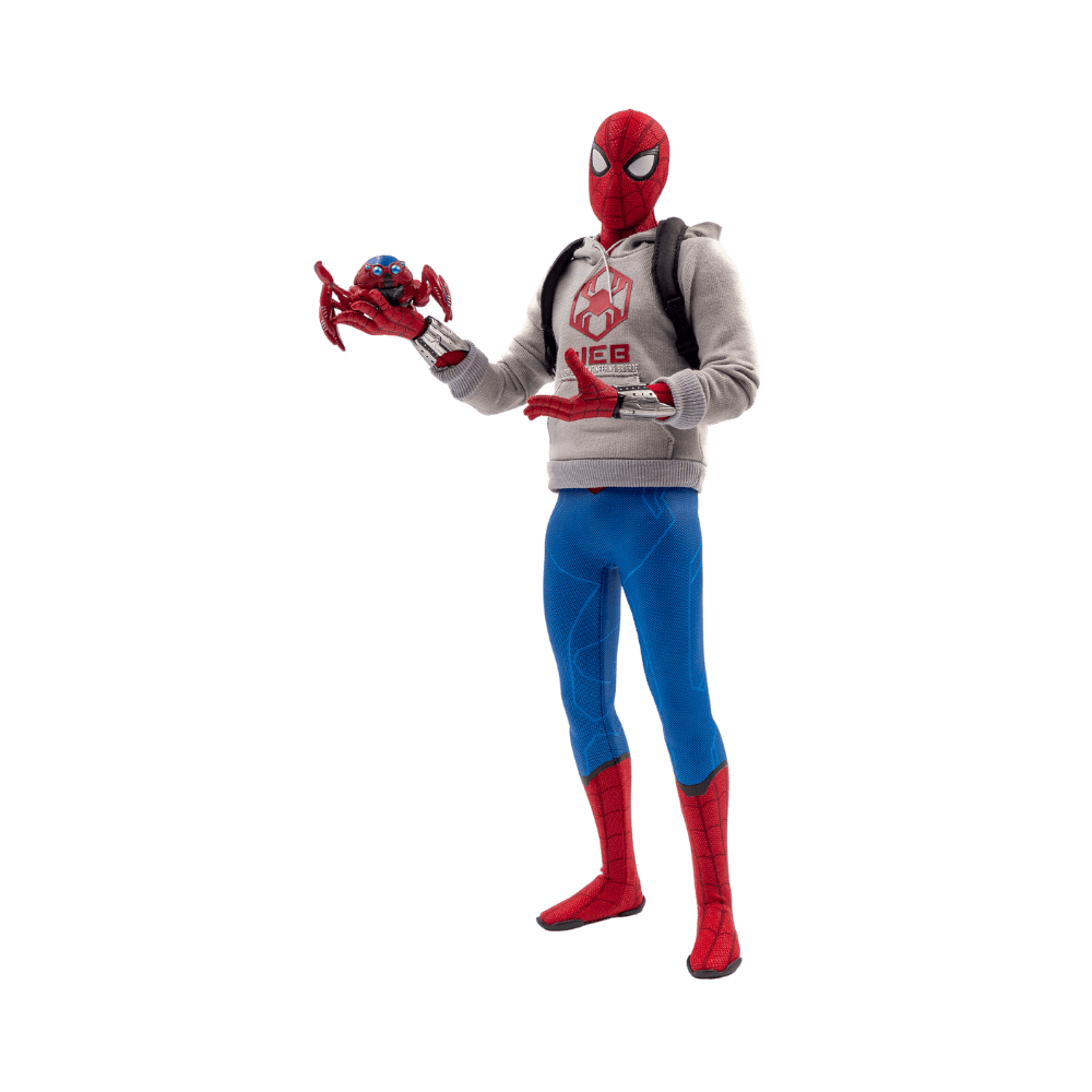 Spider-Man, wearing the latest suit developed by Tony Stark's research facility "WEB (Worldwide Engineering Brigade)" that appears in "WEB of Spider-Man", is three-dimensionalized as a high-end 1/6 scale figure with a total height of about 29 cm and more than 30 movable parts. The head wearing a mask can be replaced with five types of eye parts to create the unique expressions seen in the movie. The newly sculpted costume is a stretchy suit with a distinctive red and blue coloring, a spider mark as a symbol, and silver web shooters attached to both wrists, and the attention to detail and materials is exquisitely finished even down to the texture. Accessories include a hoodie with the "WEB" logo, a backpack, and a spider bot. The cloth hoodie can be worn on top of the suit. In addition, it comes with a variety of spider webs and effect parts that can be attached to the end of the web to recreate the deployed state. By using it together with the abundant replacement hand parts, you can create various situations. The pedestal is a special specification designed with the "WEB" logo and other designs. It uses a flexible pillar that allows you to freely change the position of the figure, so you can enjoy action scenes unique to Spider-Man, such as web swinging.
