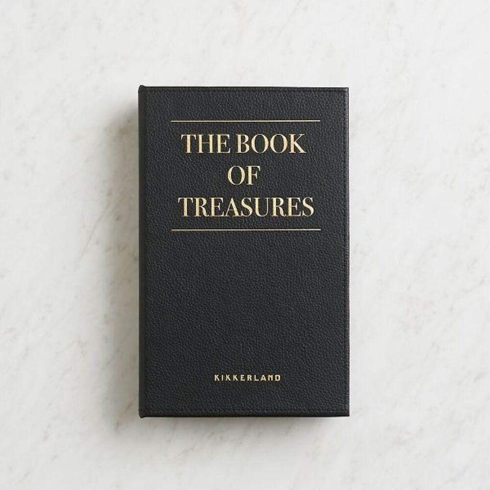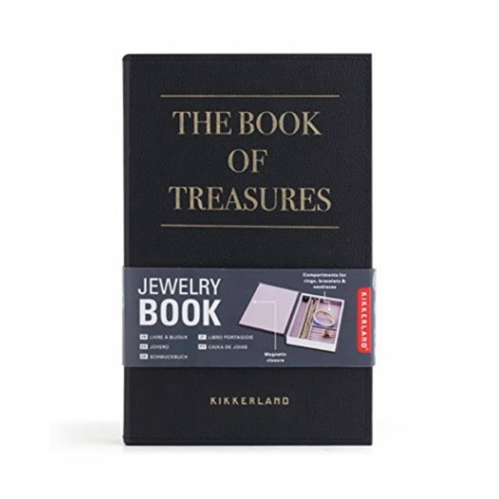 The perfect place to hide your secret treasures. This book-shaped jewelry box is bound in PU black leather, and keeps your rings and necklaces safe within its hollow, linen-lined interior. Magnet clasp seals tight. Interior snaps keep your necklaces safe to store in your bookshelf, or open on your dresser as a sneaky display.