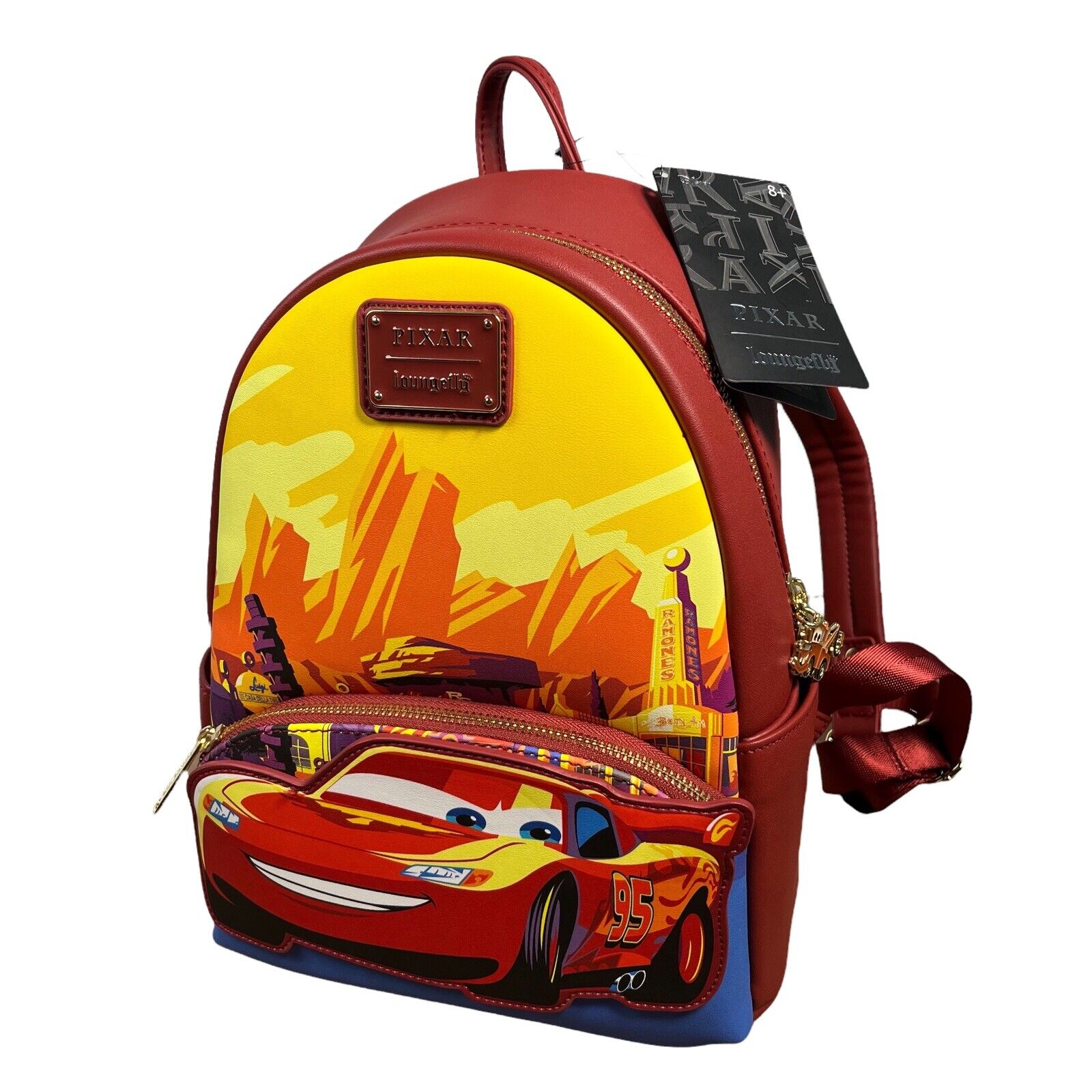 Loungefly have immortalized that lesson in the form of a sweet backpack! Lightning McQueen himself is front and center of the bag, smirking confidently. Behind him is the lost town of Radiator Springs, its desert charms brought to life with strong yellows and oranges. Featured are some of its key businesses, including Luigi’s Casa Della Tires and Ramone’s House of Body Art.