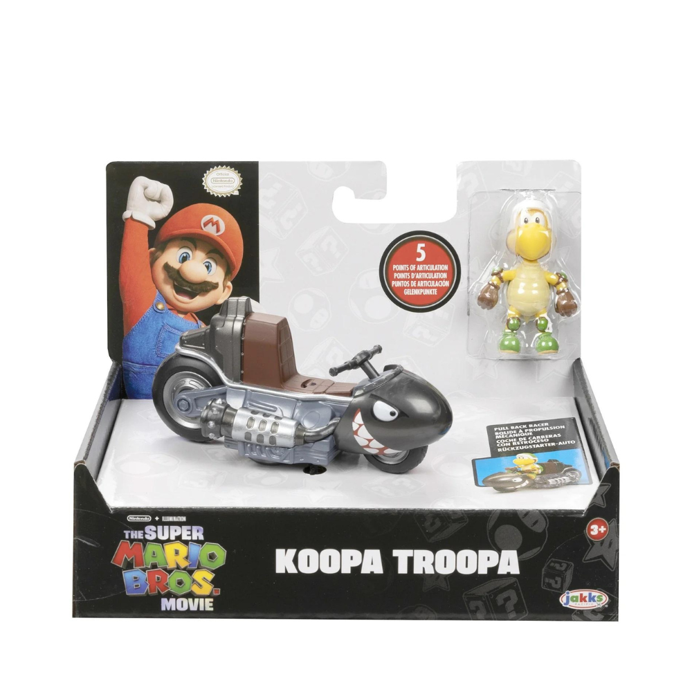 Collect your favorite characters with The Super Mario Bros. Movie 2.5” figure with pull back racers. Inspired by the movie, the Mario figure has unique articulation that allows him to sit in his Mario Kart racer. Pull back and watch him go! Wave 1 features Mario, Peach, Toad, and Koopa Troopa. You can collect them all!