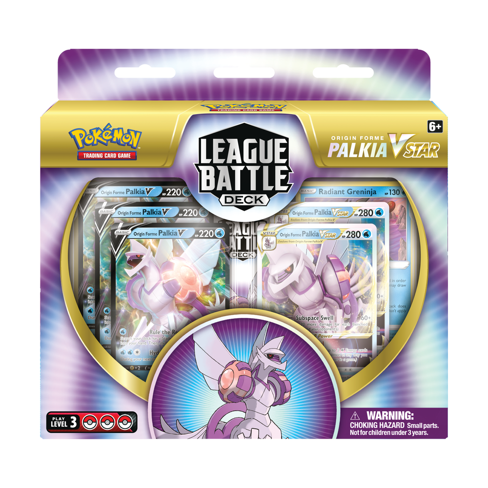 Open a Star Portal to gather power and unleash a Subspace Swell with Origin Forme Palkia VSTAR! This Pokémon VSTAR is yours in this powerful, League-ready deck for skilled Pokémon TCG players. With premium foil cards, sought-after power cards, and a well-tuned set of Pokémon and Trainer cards, the Origin Forme Palkia VSTAR League Battle Deck does more than feature a Legendary Pokémon of the Sinnoh region: it puts together all the elements to support you in your next match against friends and neighbors, in person or online!