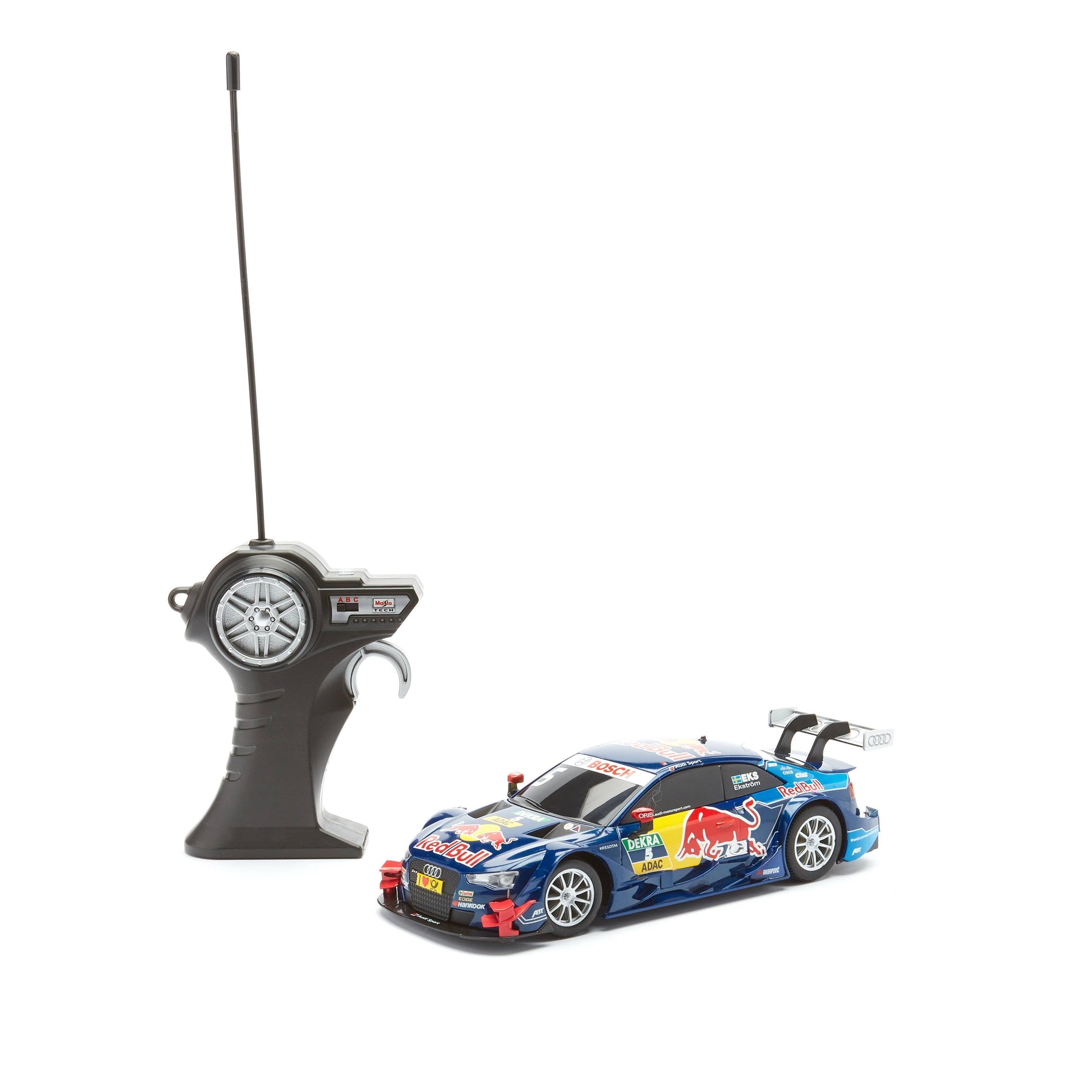 Zip around the track with this Audi RS5 DTM 2015 Red Bull 1/24 Scale Remote Control Race Car. This detailed replica features a powerful motor and independent suspension system for maximum agility. Its proportional speed control gives you powerful acceleration and tight turns. Take the checkered flag with this RC race car.