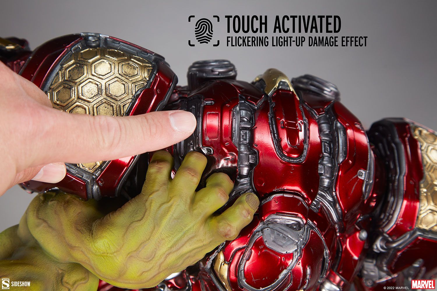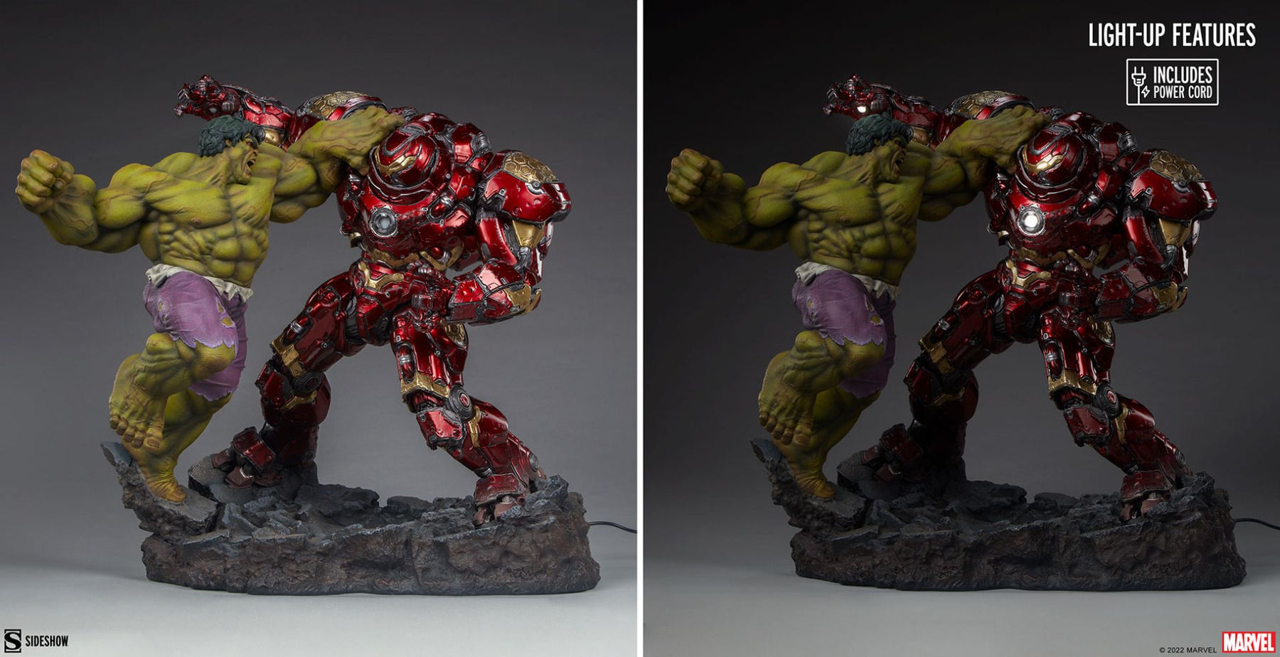 The Hulk vs Hulkbuster Maquette measures 19.5” tall and 21.6” wide, standing on top of a rubble-themed base. This polystone Marvel statue features two fully sculpted figures interlocked in an epic battle. Marvel’s Jade Giant, the Hulk, is incredibly muscled and detailed with sculpted purple pants, realistic textures and colors throughout his irradiated complexion, and a roaring portrait as he winds up his next hit. The Hulkbuster is a meticulous recreation of Tony Stark’s signature tech, with intricate defense paneling, weathered effects, and a light up feature in the eyes, arc reactor, and hand repulsors. Activate the armor in your collection with the included power cord and add another level of realism to this smashing scene!