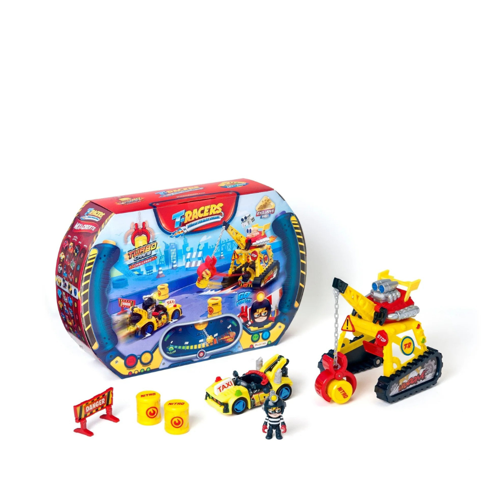 New! The T-Racers Turbo Crane Challenge! The motorised crane comes between Mr. Meaner and the road. Will he be able to pass underneath without colliding with the hook, the barrels and the fence? If he can….it’s prize time! He will send his enemies flying and be able to continue his journey at top speed. 3… 2… 1… Off he goes! Remember that you can swap all your parts with T-Racers, including the wheels to customise any vehicle. There are more than 500 possible combinations!